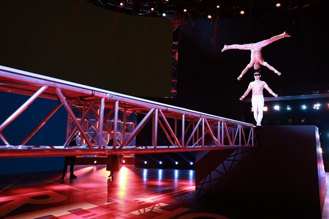 | The Giang brothers do a balancing act on a 50cm-wide and 2m-high beam. Nghiệp balanced vertically atop his brother's head while Cơ climbed 10 steps up, went across 10m and went down 10 steps in 1min 55sec. |
