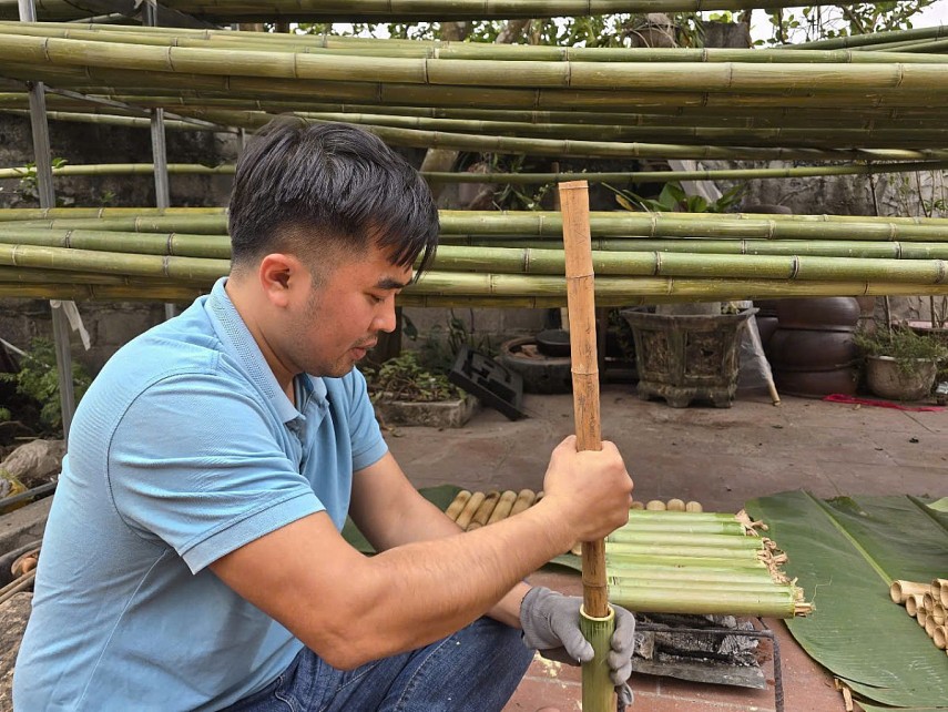 Duyet said he was taught to make bamboo tube tea by a tea artisan in Na Thac Village, Phuong Do Commune, Vi Xuyen District, Ha Giang Grovince 11 years ago. Fresh bamboo trees taken from the forest are sawed into shorter tubes of about 22 centimeters long each.