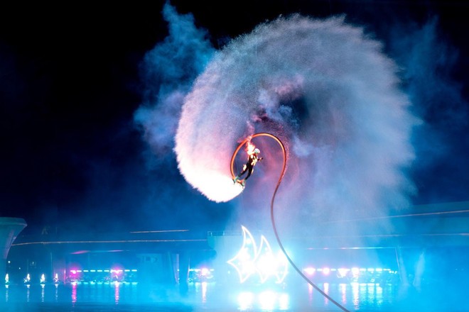 Twenty jetski racers will glide across the water, creating stunning light trails in the night, while eight flyboard athletes soar into the sky with breathtaking acrobatics. Three female jazzers will elegantly dance on the water in LED-lit costumes, appearing like ocean fairies. The dazzling fireworks display will illuminate the entire bay, promising an unprecedented spectacle in Cat Ba. "Symphony of Green Island" is set to launch on May 23, running for 30 minutes from 8:30 PM to 9:00 PM throughout the four summer months.