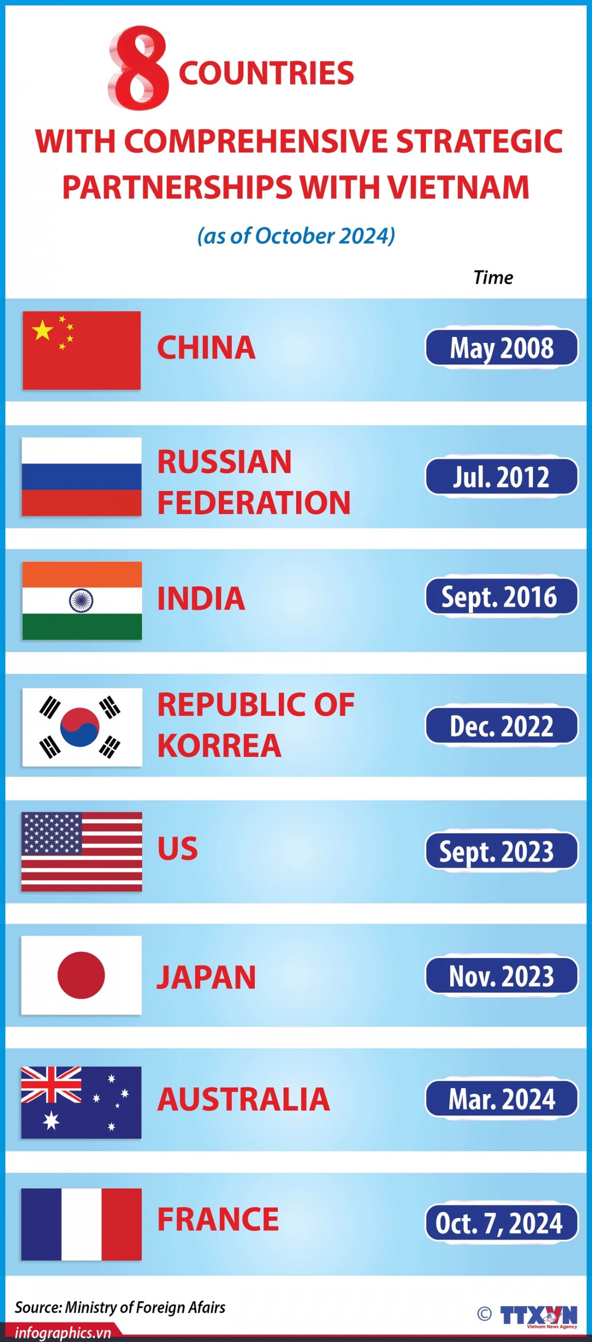 On the occasion of the official visit to France by Party General Secretary and President To Lam on October 7, 2024, Vietnam and France issued a joint statement on upgrading their relations to a Comprehensive Strategic Partnership. As of October 2024, Vietnam has Comprehensive Strategic Partnership with eight countries.