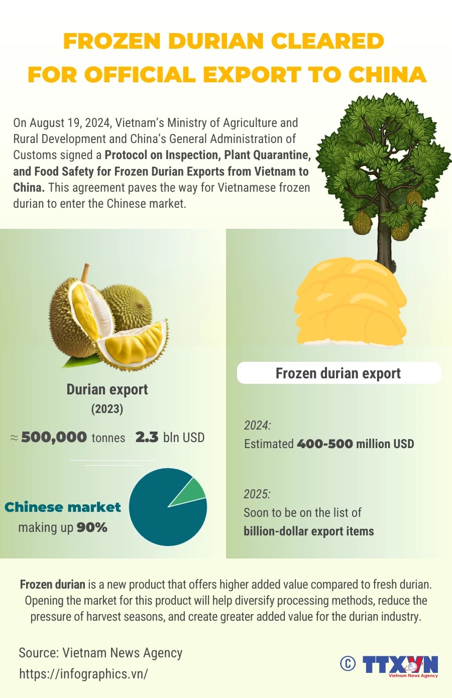 On August 19, 2024, Vietnam’s Ministry of Agriculture and Rural Development and China’s General Administration of Customs signed a Protocol on Inspection, Plant Quarantine, and Food Safety for Frozen Durian Exports from Vietnam to China.