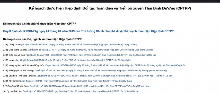 For example, regarding the Comprehensive and Progressive Agreement for Trans-Pacific Partnership (CPTPP), the FTAP integrates Decision No.121/QD-TTg dated January 24, 2019 of the Prime Minister and 25 decisions of ministries and sectors on the CPTPP implementation plan.