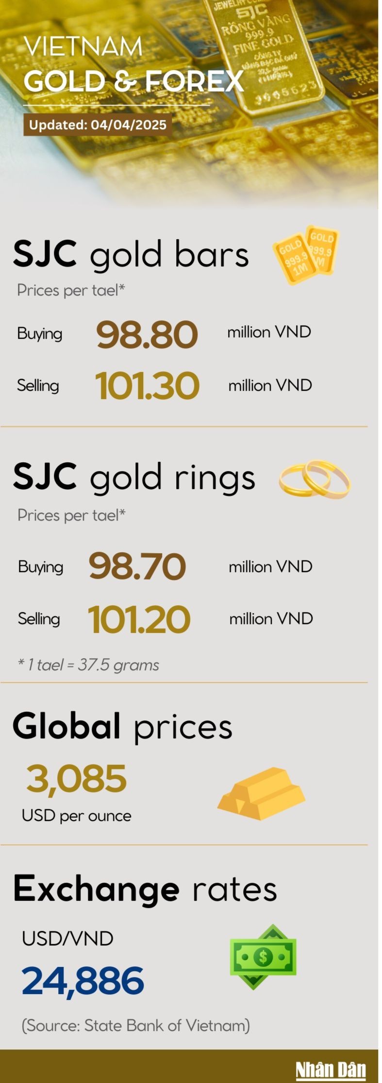 On April 4, global gold prices fluctuated significantly, trading at 3,085 USD per ounce after US President Donald Trump announced new retaliatory tariffs on goods from different countries. In the domestic market, SJC gold bars and rings both saw a decline, trading at 101.3 million VND and 101.2 million VND per tael respectively.