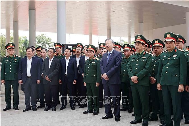 | Party General Secretary To Lam (3rd from right, 1st row), who is also Secretary of the Central Military Commission, visits the Vietnam Military History Museum in Hanoi on December 3 (Photo: VNA) |