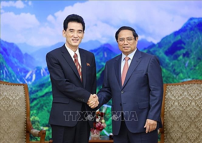 | Prime Minister Pham Minh Chinh (right) and Ambassador of the Democratic People's Republic of Korea Ri Sung Guk. (Photo: VNA) |