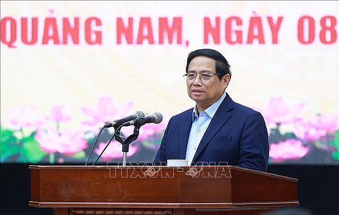 | PM Pham Minh Chinh speaks at the meeting with leaders of Quang Nam province on February 8, 2025. (Photo: VNA) |