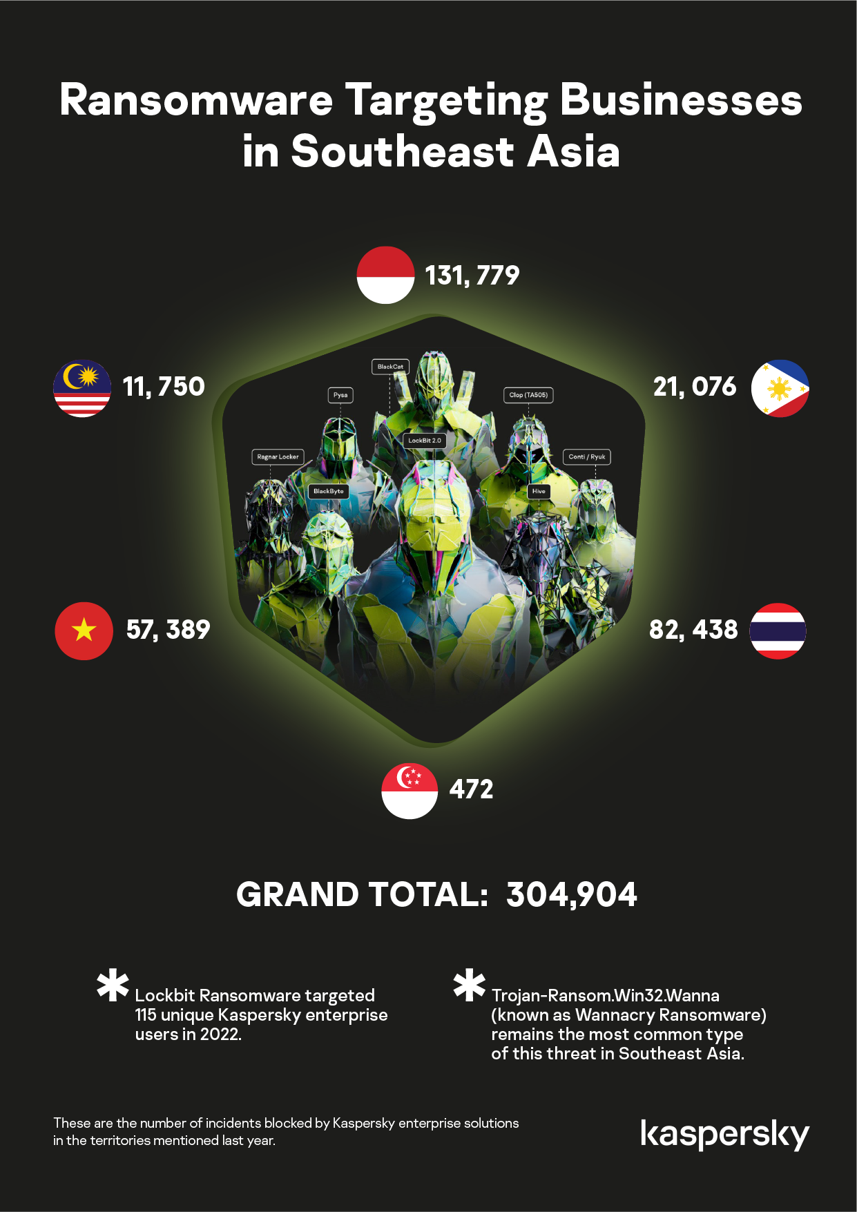 Indonesia recorded the highest number of incidents foiled by Kaspersky B2B solutions (131,779), followed by Thailand (82,438), and Vietnam (57,389). The Philippines logged a total of 21,076 ransomware attacks; Malaysia had 11,750, and Singapore had 472.