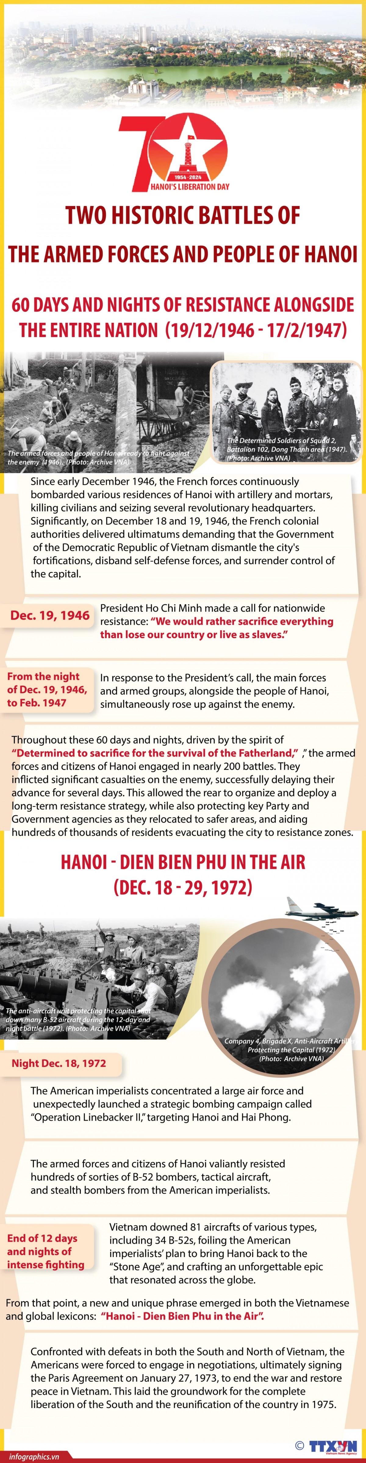 The armed forces and people of Hanoi take great pride in two historic battles: the 60-day and night resistance alongside the entire nation (December 19, 1946 - February 17, 1947), and the 12-day and night of Hanoi - Dien Bien Phu in the air (December 18 - 29, 1972).
