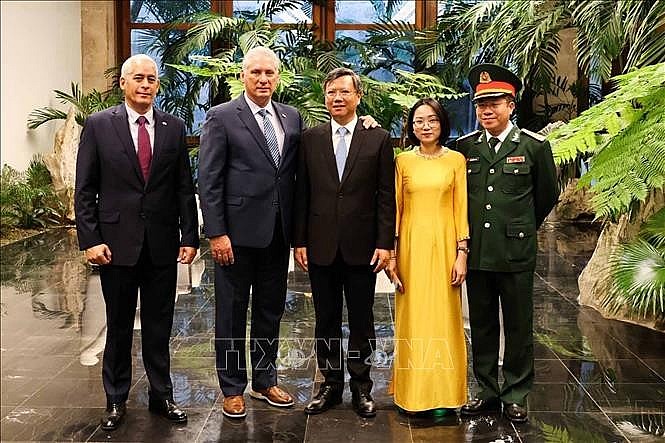 | A photo of Cuban President Miguel Díaz-Canel Bermudez (second from left), Vietnamese Ambassador Le Quang Long (centre), and delegates from both sides (Photo: VNA) |
