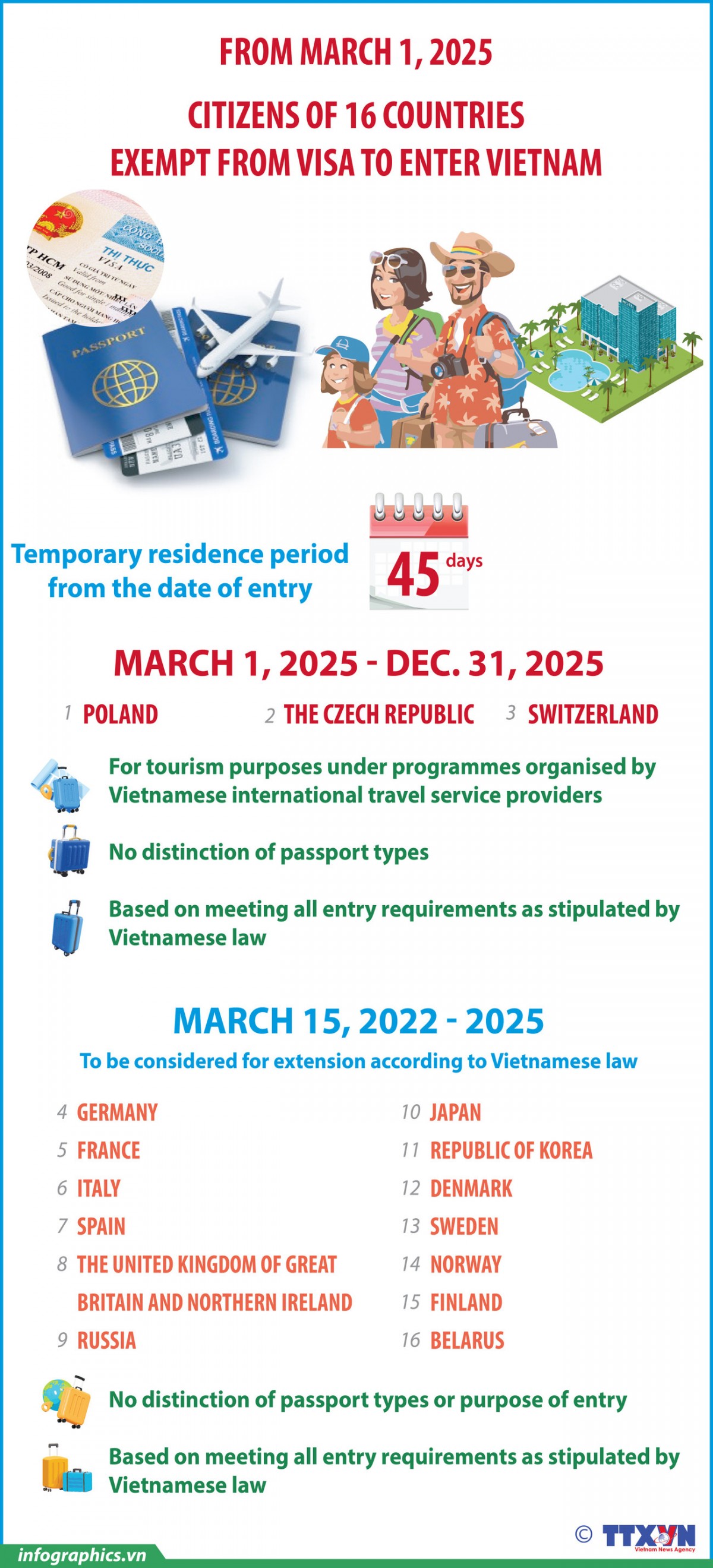 Vietnam grants visa exemptions to citizens of 16 countries from March 1, 2025 to December 31, 2025, as part of the country's tourism development stimulus programme.