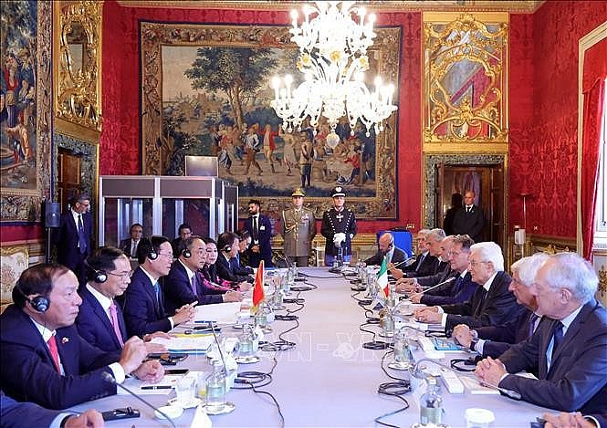The two Presidents noted with pleasure that economic-trade-investment ties have been developing fruitfully with bilateral trade reaching 6.2 billion USD in 2022. Vietnam is currently the biggest trading partner of Italy in the Association of Southeast Asian Nations (ASEAN), while Italy is a leading partner of Vietnam in Europe. Italy now ranks 33rd out of 143 countries and territories directly investing in Vietnam.
