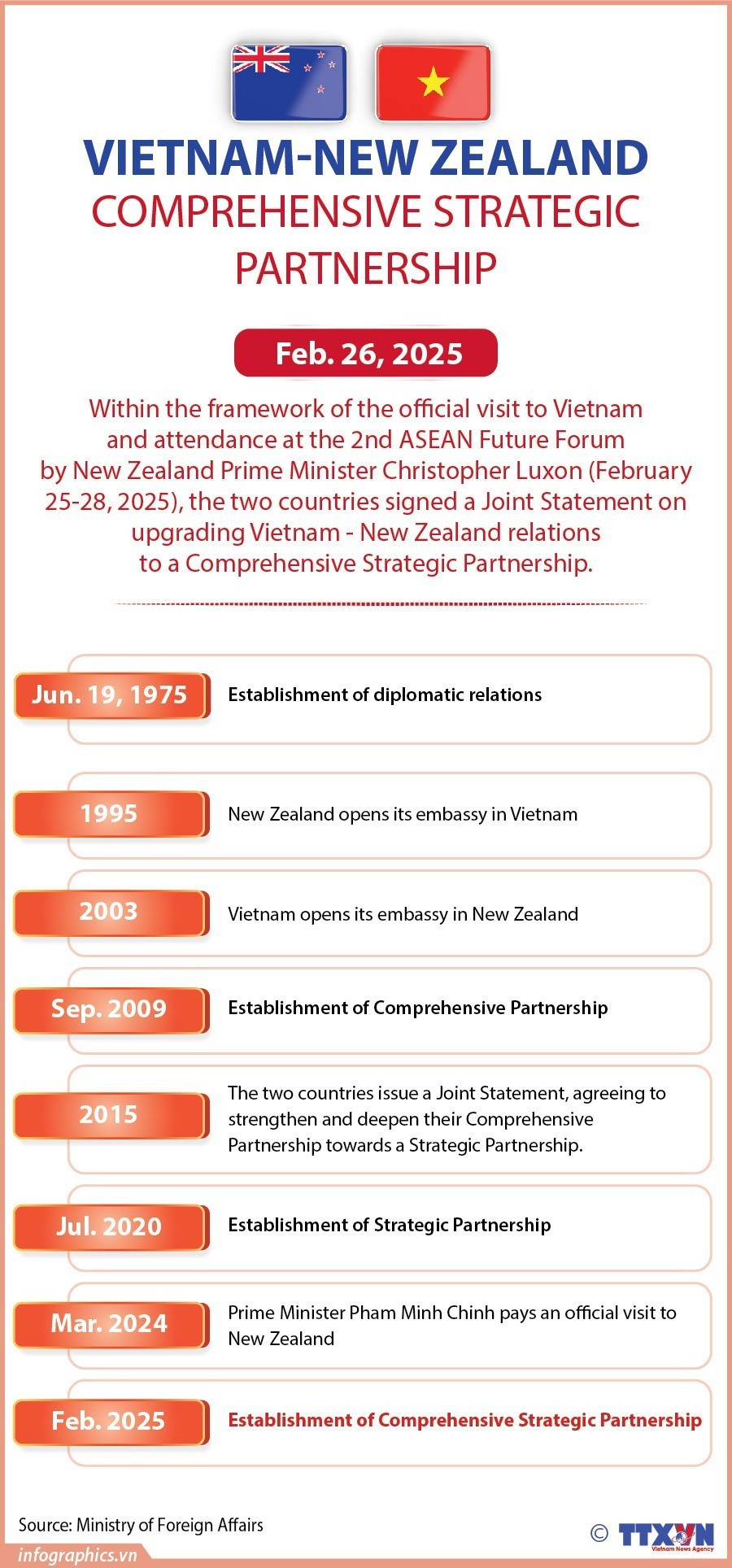 Within the framework of the official visit to Vietnam and attendance at the 2nd ASEAN Future Forum by New Zealand Prime Minister Christopher Luxon (February 25-28, 2025), the two countries have signed a Joint Statement on upgrading Vietnam - New Zealand relations to a Comprehensive Strategic Partnership.
