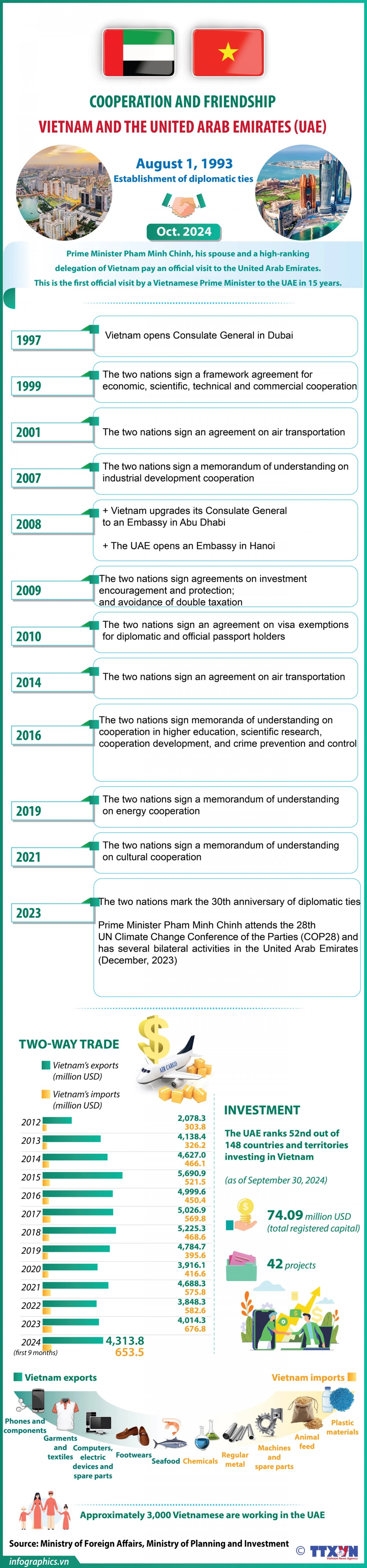 The relationship between Vietnam and the United Arab Emirates (UAE) has been progressing well, delivering many tangible results. The UAE is the first country in the Middle East-Africa region with which Vietnam has initiated discussions to elevate bilateral ties to a new level. Economically, the UAE is Vietnam's largest export market in this region.